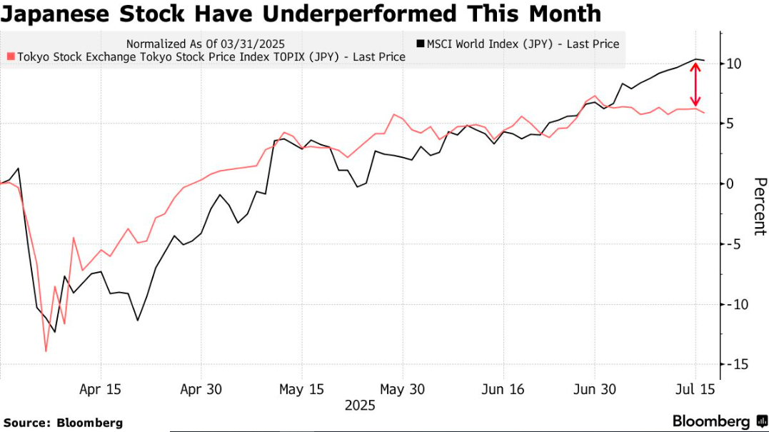 自本月以来,上述政治担忧已给日本市场带来了明显压力,7月日本股市的表现明显逊于MSCI全球指数——东证指数7月迄今累计下跌了1.2%,结束了此前连续三个月的涨势。