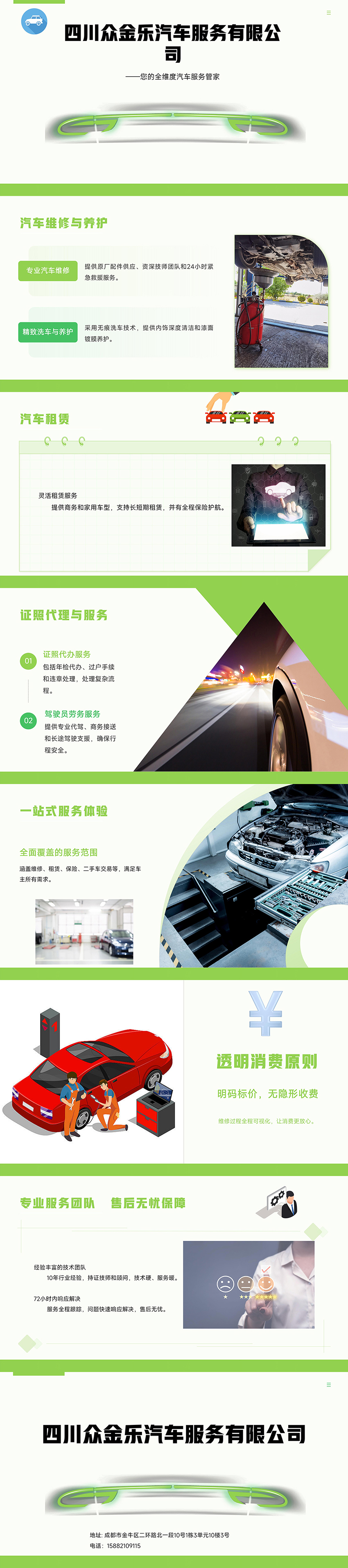 四川众金乐汽车服务有限公司——全维度汽车服务管家 2025-08-15 47925阅读 在车水马龙的城市中,每一次出行都是一场独特的旅程,而四川众金乐汽车服务有限公司,愿成为您这段旅程中最可靠的伙伴。我们深知,汽车对于您而言,不仅是出行工具,更是生活中不可或缺的一部分。众金乐汽车服务始终秉持着以客户为中心的理念,致力于为您打造全方位、高品质的汽车服务体验。从您踏入我们门店的那一刻起,就能感受到那份与众不同的热情与专业。我们的工作人员以真诚的微笑迎接每一位客户,耐心倾听您的需求,因为我们明白,只有深入了解您的期望,才能为您提供最贴心的服务。