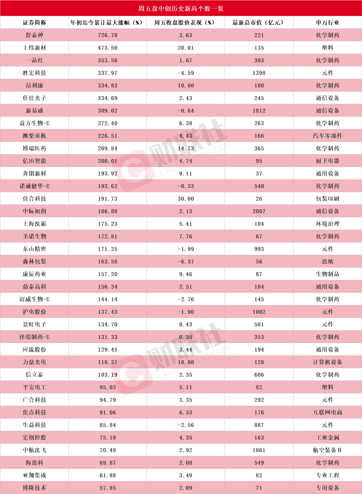 据Choice数据统计显示,剔除新股次新股以及ST股,包括舒泰神、上纬新材、一品红、胜宏科技、昂利康、仕佳光子、新易盛、益方生物-U、潍柴重机、博瑞医药、亿田智能、奔朗新材、诺诚健华-U、佳合科技、中际旭创、上海洗霸、圣诺生物、东山精密、森林包装、康辰药业、鼎泰高科、迈威生物-U、沪电股份、景旺电子、泽璟制药-U、应流股份、力鼎光电、信立泰、平安电工、广合科技、焦点科技、生益科技、宏创控股、中航沈飞、海思科、亚翔集成和博隆技术在内的37家A股上市公司周五盘中创出历史新高(前复权),具体详见下图: