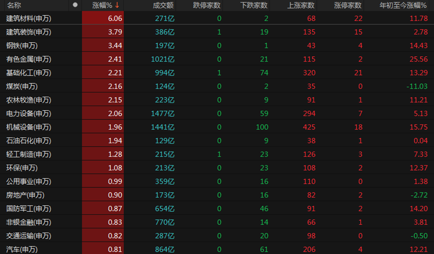 建筑装饰、钢铁、有色金属、基础化工、煤炭等板块涨幅也超过2%,筑博设计等15只建筑装饰个股涨停,西宁特钢等4只钢铁股涨停,博源化工等21只基础化工个股涨停。