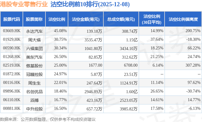 从沽空比例来看,永达汽车、周大福、六福集团沽空比例位居行业前三,分别为45.08%、30.75%、30.34%。