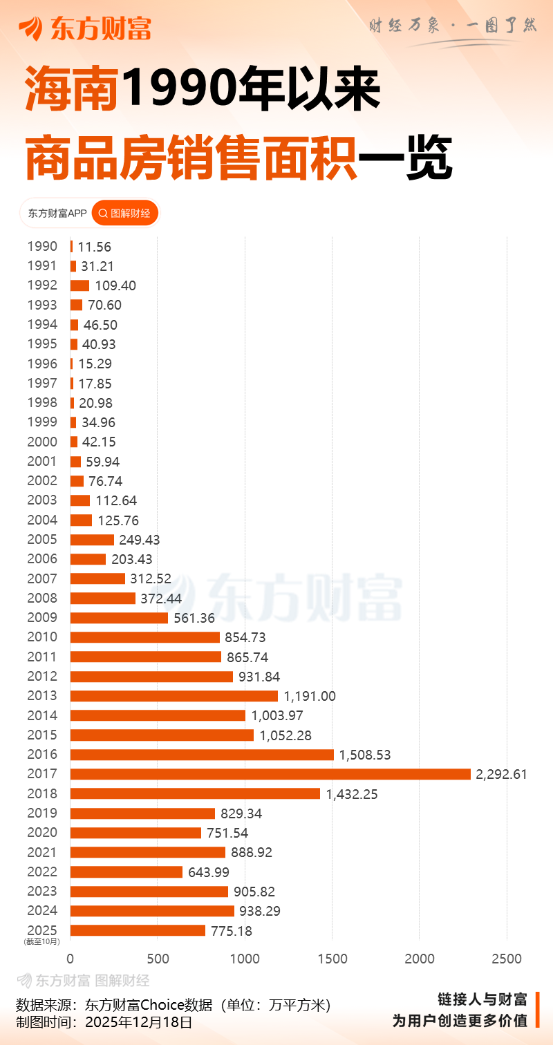 据海南省统计局近期数据,今年1-10月,海南全省新建商品房销售额为1279.51亿元,同比增长17.4%;新建商品房销售面积775.18万平方米,同比增长8.0%。