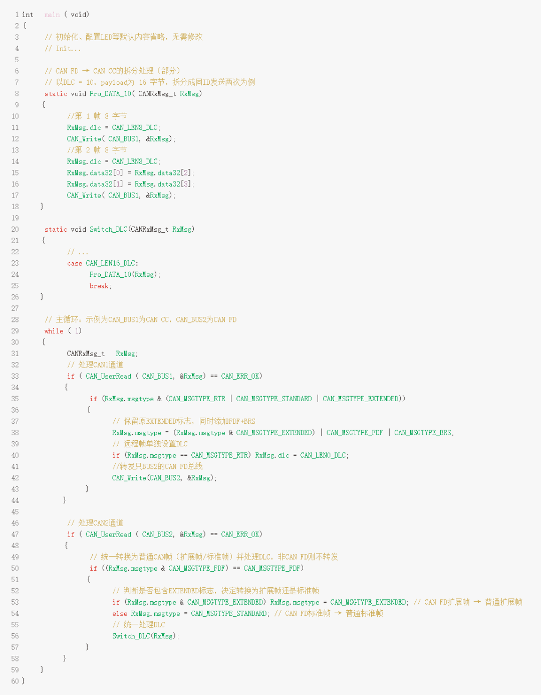 此时CAN FD报文的数据量的能被CAN CC单帧承载,只需修改报文类型(如将CAN FD的FDF/BRS标识转为CAN CC的STANDARD/EXTENDED类型),就能直接双向转发,操作最简单。