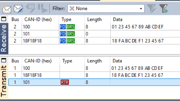 我们搭建了测试环境:BUS1(CAN CC)比特率 500kbit/s,BUS2(CAN FD)仲裁段比特率500kbit/s、数据段比特率2Mbit/s,实测两种方向的转换均稳定可靠: