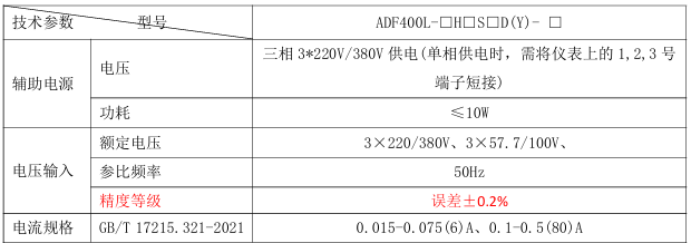 所有接入回路的用电数据,均由ADF400L统一进行高精度测量与处理,其电能计量精度达到0.2级。这意味着:ADF400L技术参数: