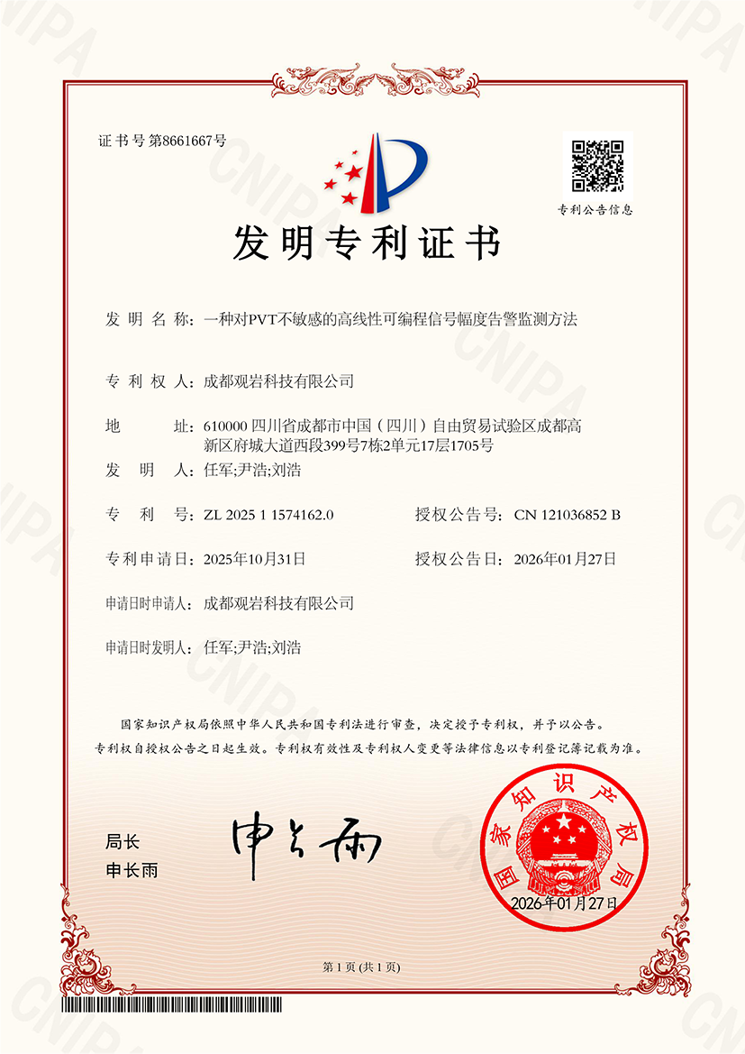 一项专利的落地,凝聚着研发团队的坚守与打磨。自成立以来,观岩技术团队深耕研发、迭代方案、严抓可靠性,此次发明专利的斩获,进一步丰富了公司知识产权储备,筑牢核心技术壁垒,助力企业在激烈市场竞争中抢占先机,也为半导体行业信号监测技术升级提供了新思路与新支撑,尽显以技术创新驱动行业发展的责任与担当。